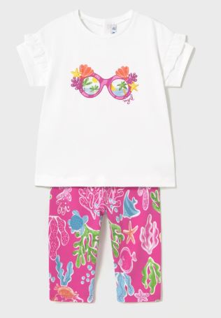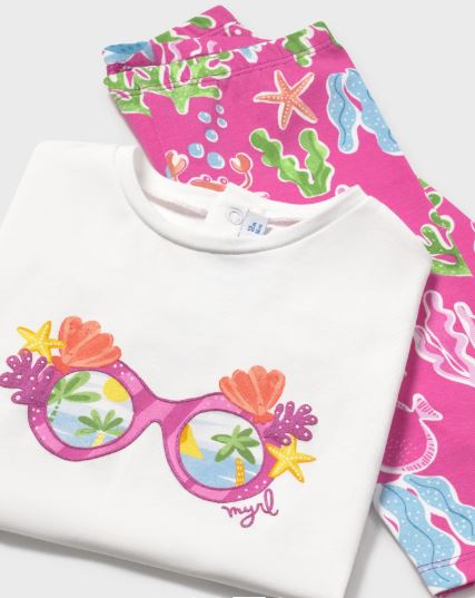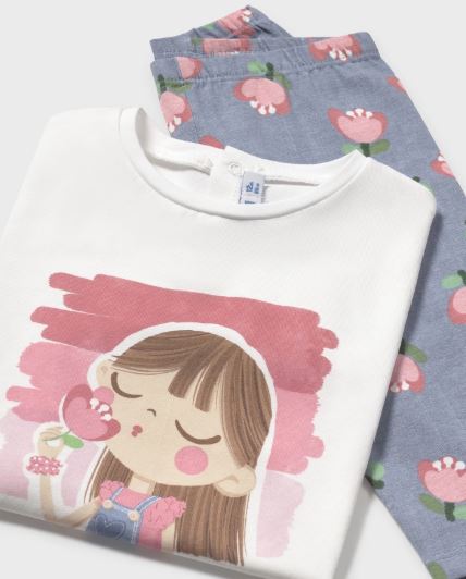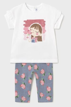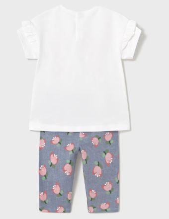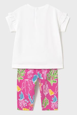 Completo due pezzi per bebé costituito da maglietta e pantalone modello leggings abbinati.