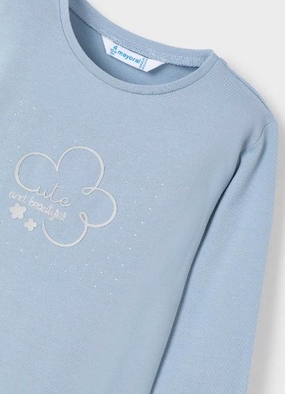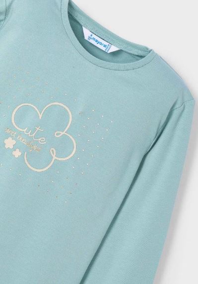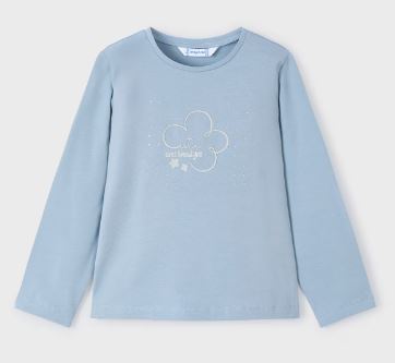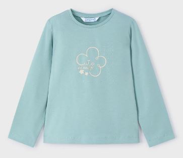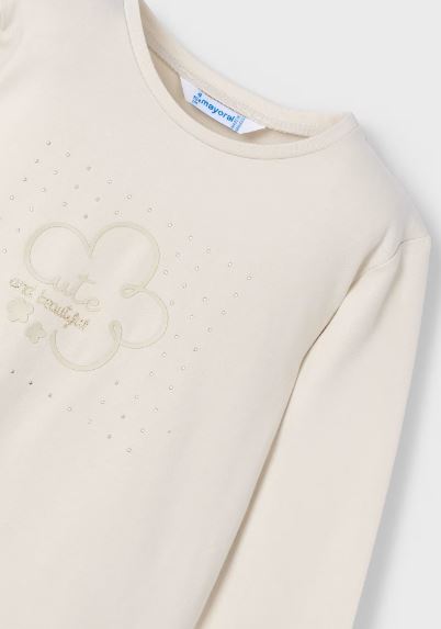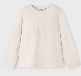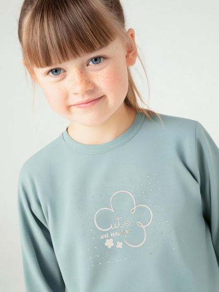 Maglietta manica lunga per bambina. Morbido tessuto di cotone elasticizzato. Elementi decorativi: glitter, strass. Per motivi di sicurezza, le taglie piccole (2-3 anni) possono subire alcune variazione negli elementi decorativi utilizzati.