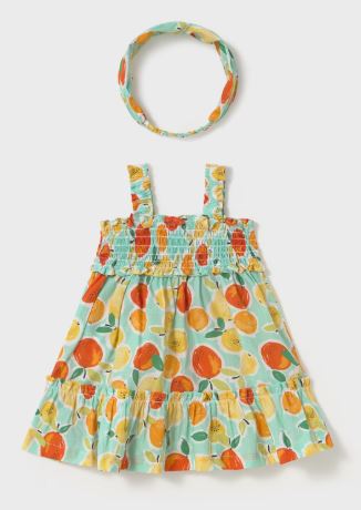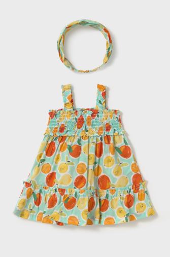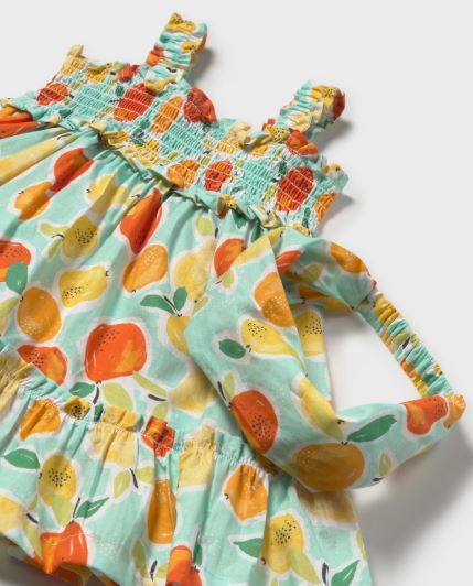 Vestito con bretelle per neonata. Colletto retto. Tessuto 100% cotone. Questo modello presenta dettagli nido d'ape. Modello con riccio. Design stampato.