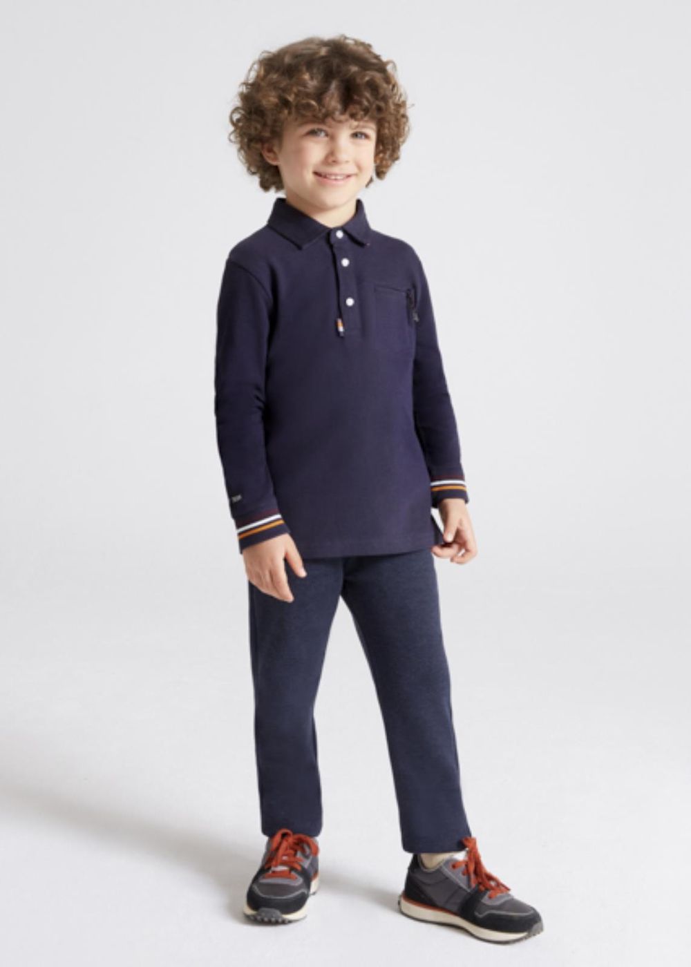 Pantalone lungo per bambino modello chino e taglio retto, tessuto morbido e leggermente elasticizzato. Vita elasticizzata con cordoncino regolabile. Ginocchiere rinforzate nella parte anteriore pensate per donare maggiore resistenza nella zona più esposta ad usura.
