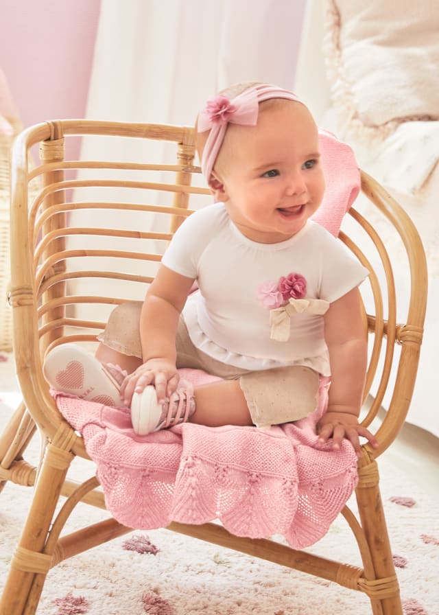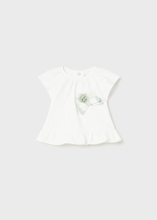 Maglietta per neonato. Girocollo. Chiusura con bottoni a pressione nella parte posteriore che facilitano la vestibilità del capo. Design con volant decorativo nella parte bassa.