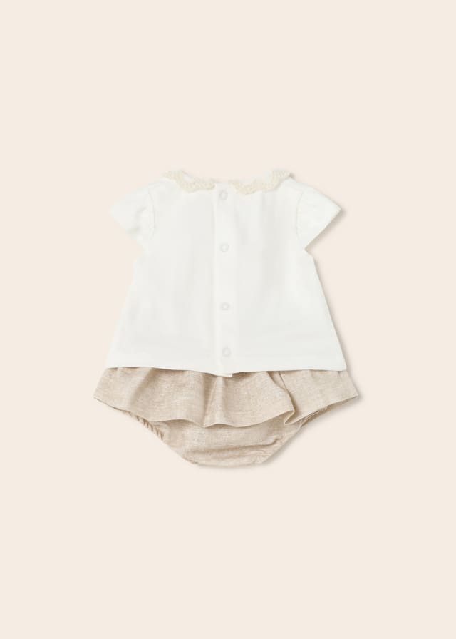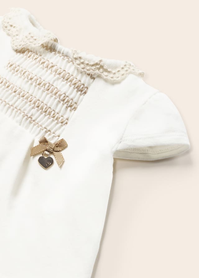 Maglietta manica corta per neonato. Chiusura con bottoni a pressione nella parte posteriore che facilitano la vestibilità del capo. Elementi decorativi: dettagli arricciati con nido d'ape.