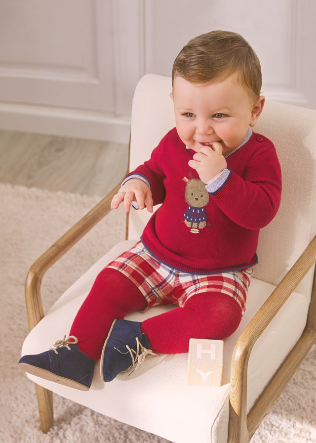 Questo completo tre pezzi per neonato è costituito da un delizioso maglioncino, un pantaloncino e una calzamaglia abbinata.