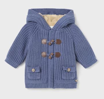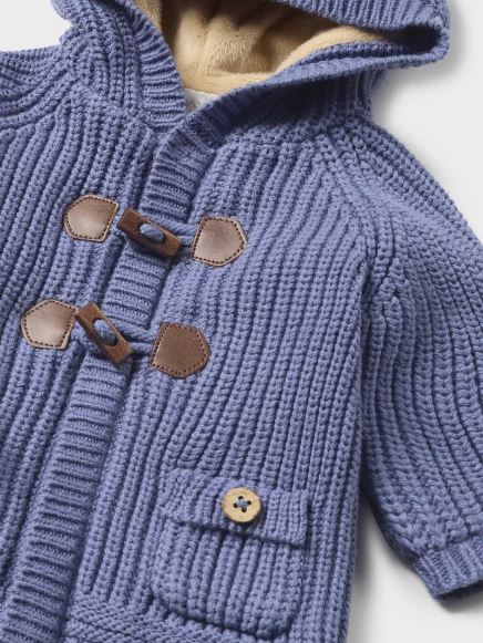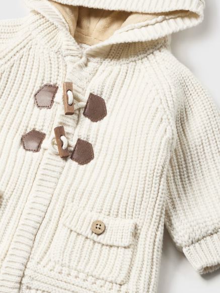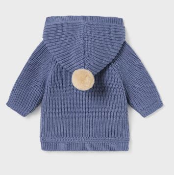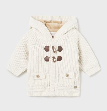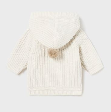 Giacca in maglia manica lunga per neonato. Modello con cappuccio. Chiusura con cerniera anteriore e alamari. Tessuto caldo e morbido. Parte interna del corpo con pellicciotto morbido. Elementi decorativi: pompon.