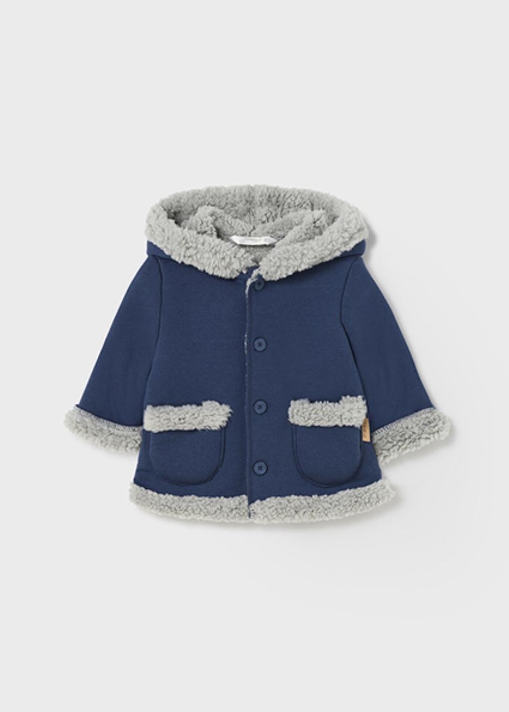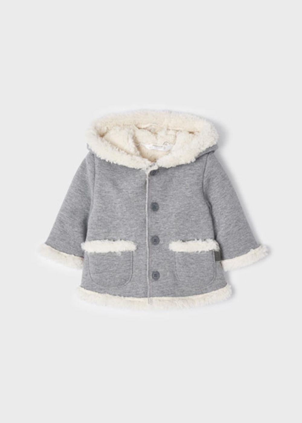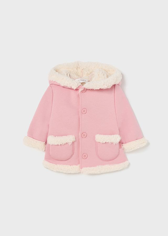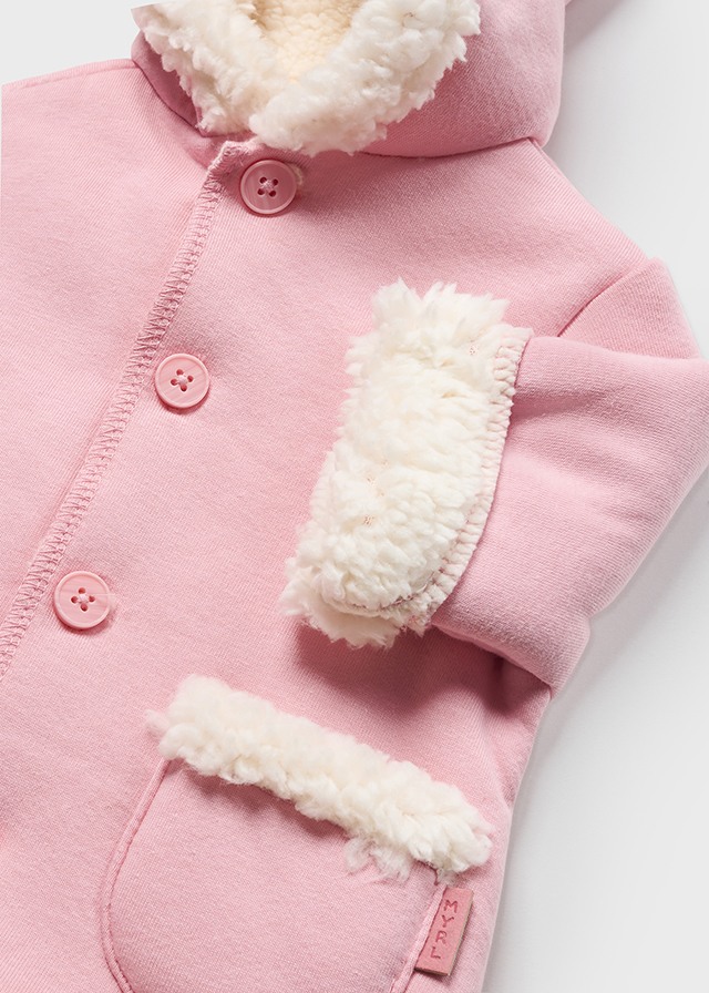 Giaccone manica lunga per neonato. Modello con cappuccio. Chiusura con bottoni nella parte anteriore. Fodera interna con pellicciotto.