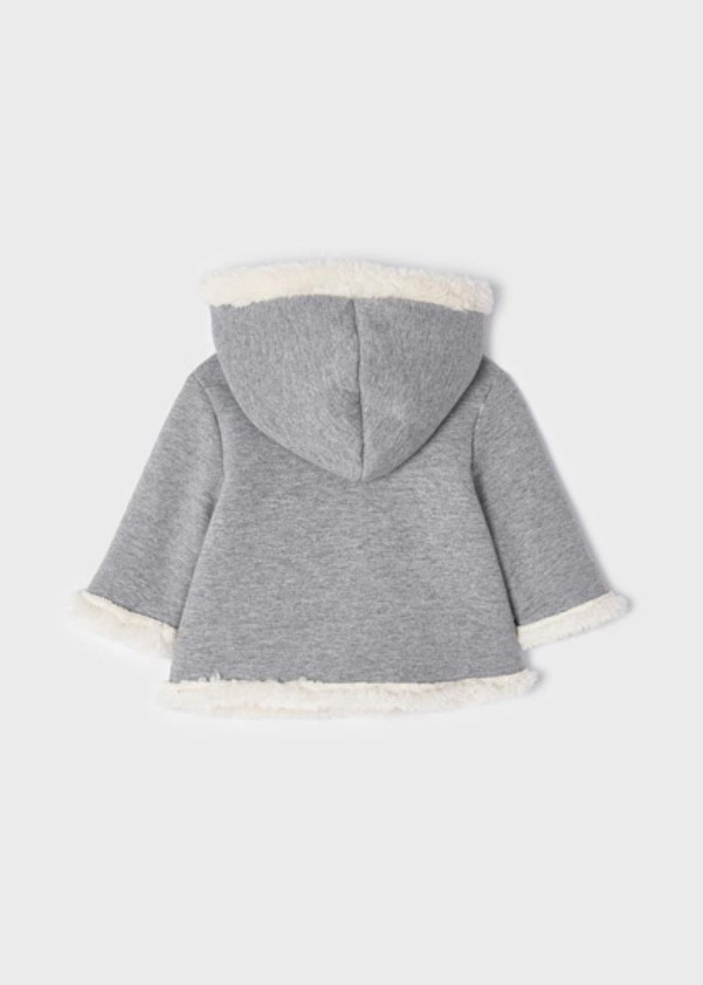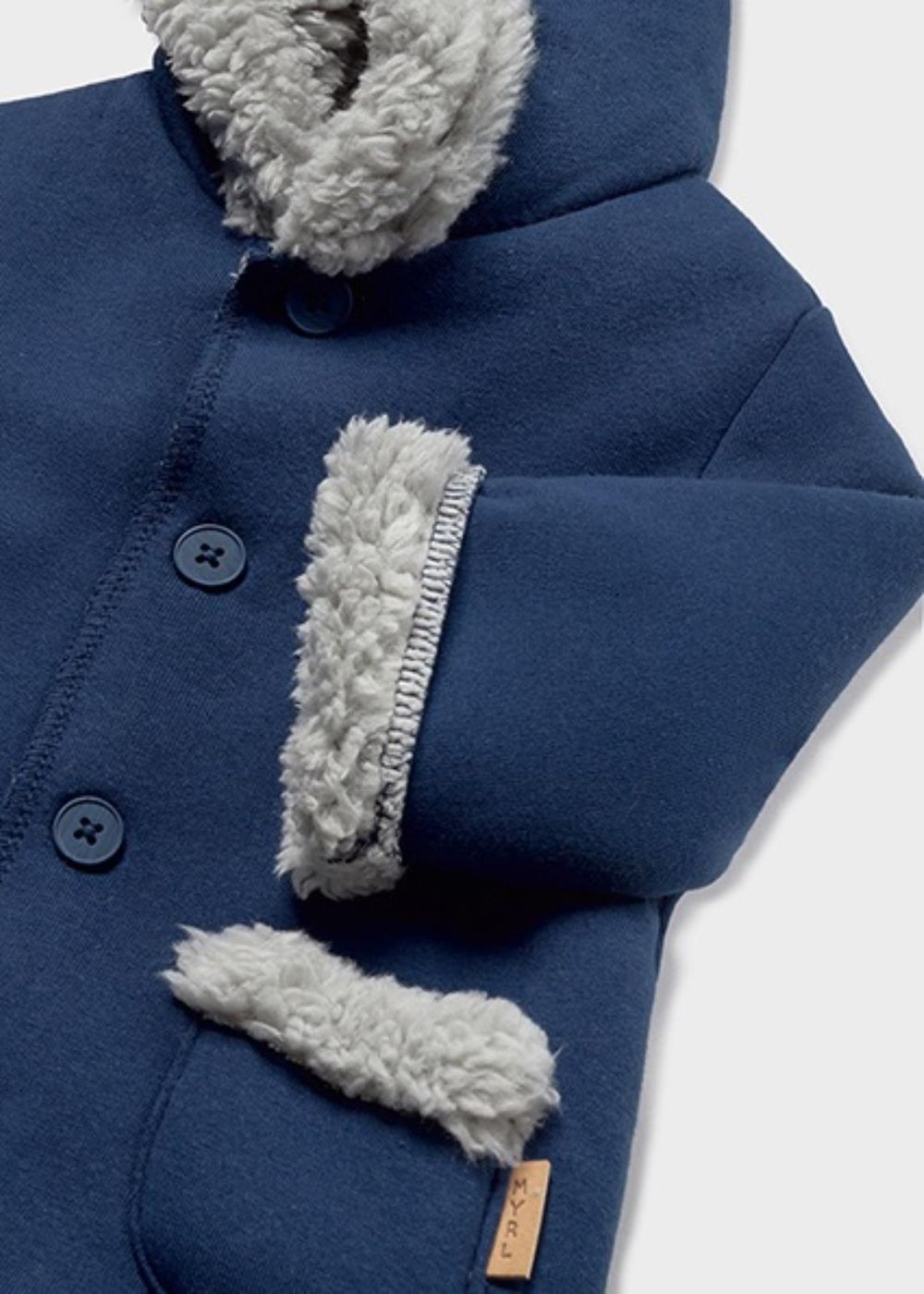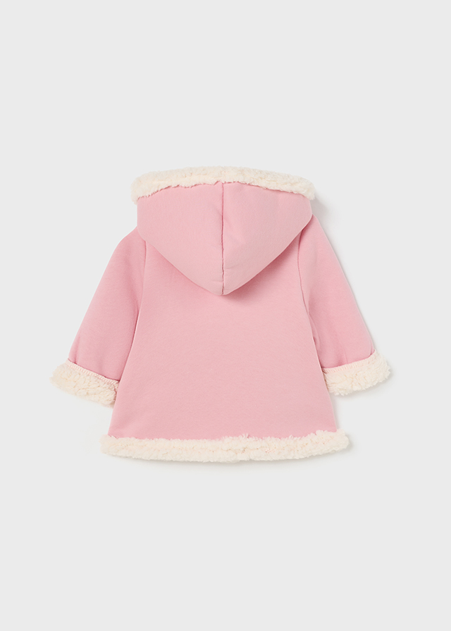 Giaccone manica lunga per neonato. Modello con cappuccio. Chiusura con bottoni nella parte anteriore. Fodera interna con pellicciotto.