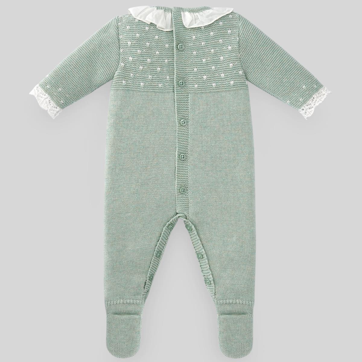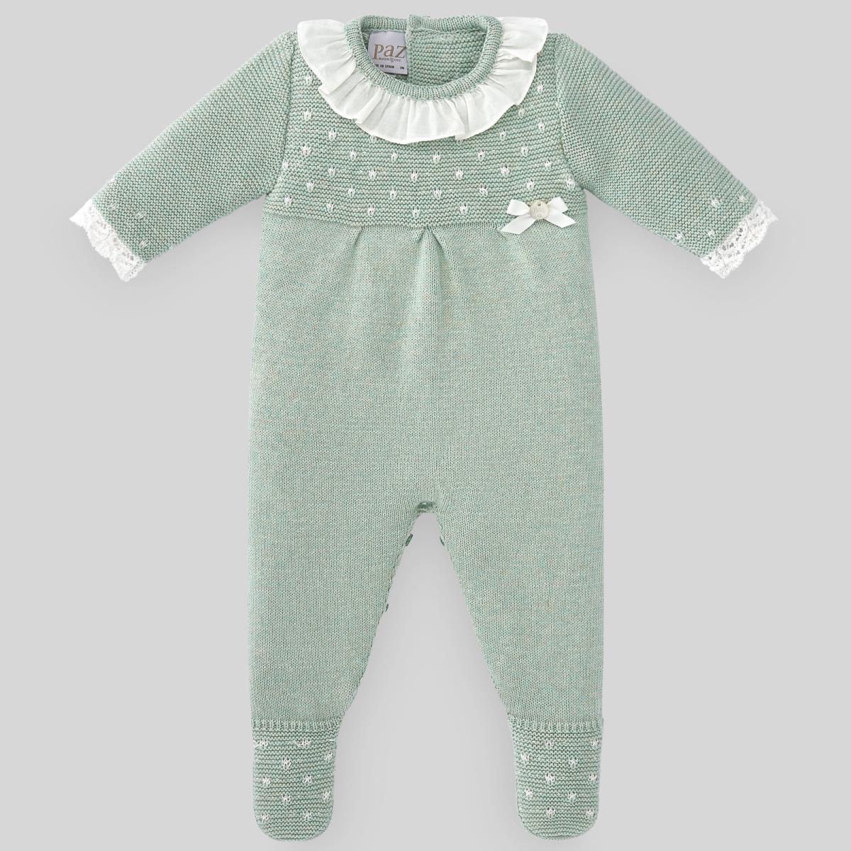 Tutina lungo in maglia per bebè con dettagli a pois bianchi. Pizzo sulla manica e fiocco decorativo con placca PAZ Rodríguez. Colletto bianco con balza in tessuto.