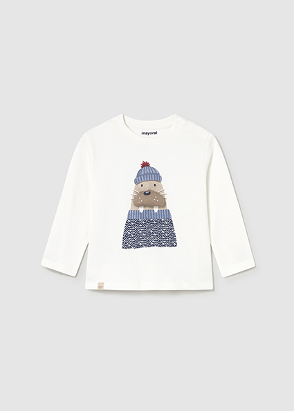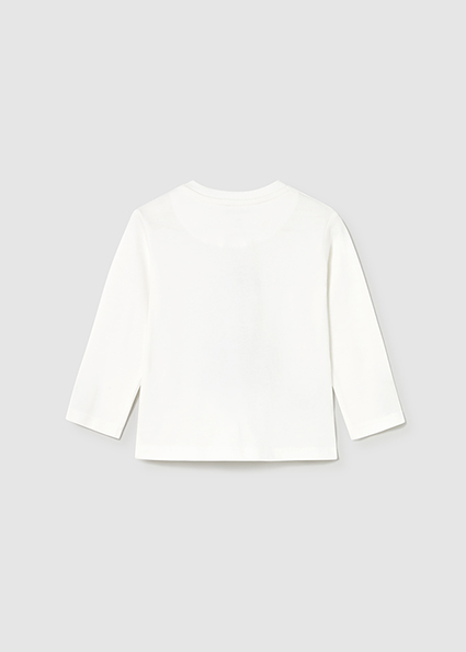 Maglietta manica lunga per neonato. Girocollo. Chiusura con bottoni a pressione sulla spalla che facilitano la vestibilità del capo. Elementi decorativi: Serigrafia (print). A partire dalla taglia 6-9, l'apertura laterale è sostituita da bottoni a pressione sulla spalla.