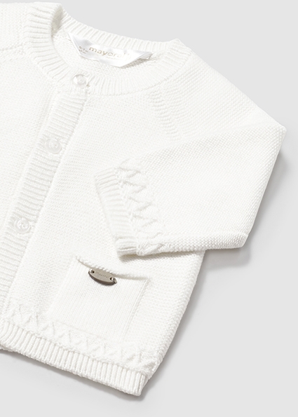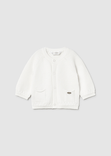 Contiene poliammide riciclato. Giacca modello cardigan manica lunga per neonato. Girocollo. Chiusura con bottoni nella parte anteriore. Tessuto in tricot morbido al tatto. Tasche funzionali nella parte anteriore.