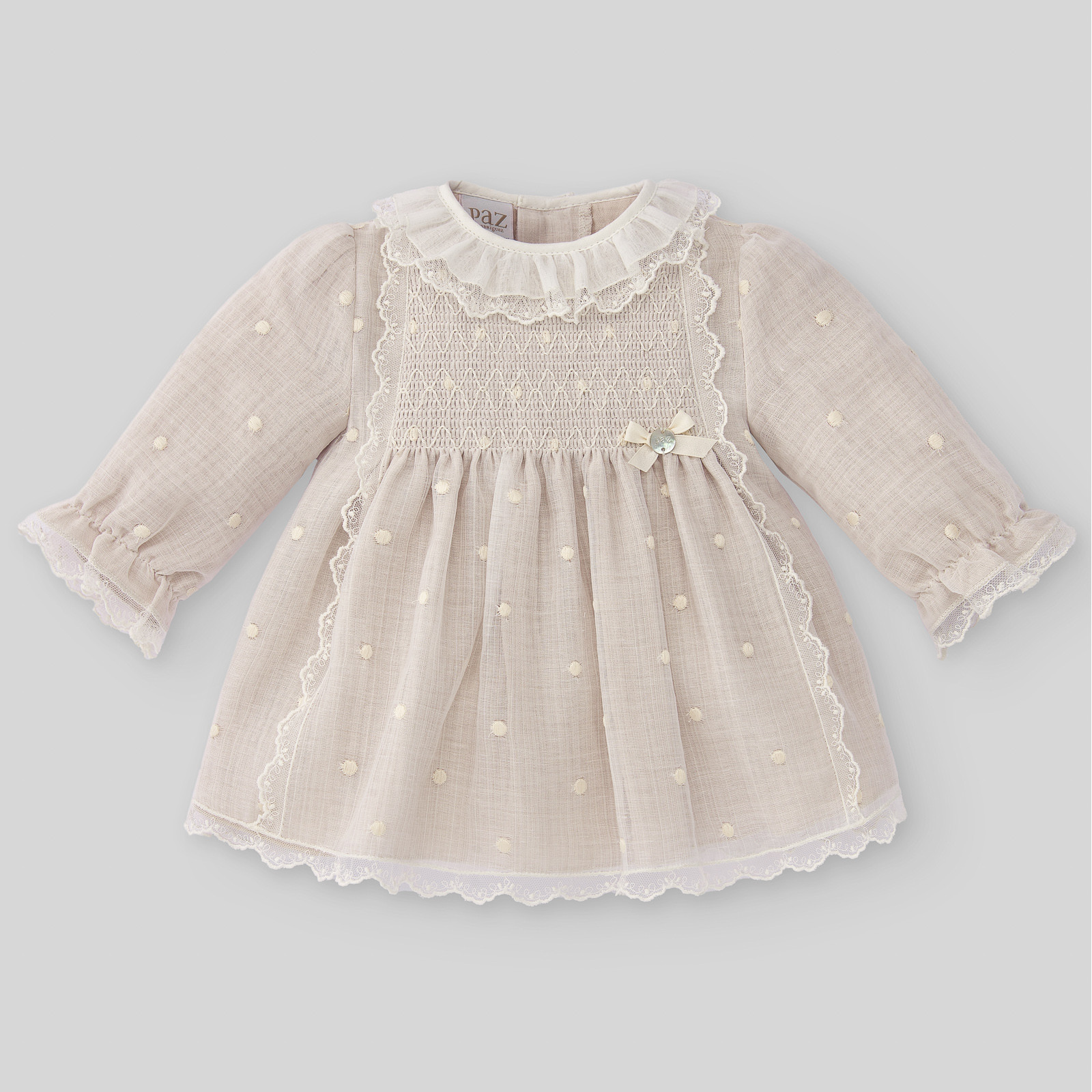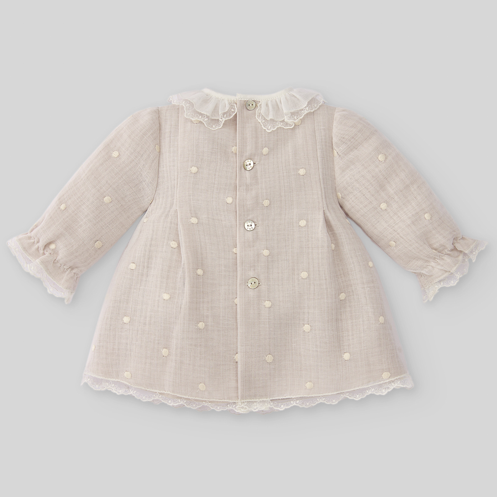 Vestito per neonata. Tessuto in organza ricamata con pois e dettaglio di pizzi. Colletto con volant e punto nido d'ape sul petto. Rifinitura di pizzi sul bordo inferiore e sui polsini. Chiusura posteriore con bottoni dello stesso colore.