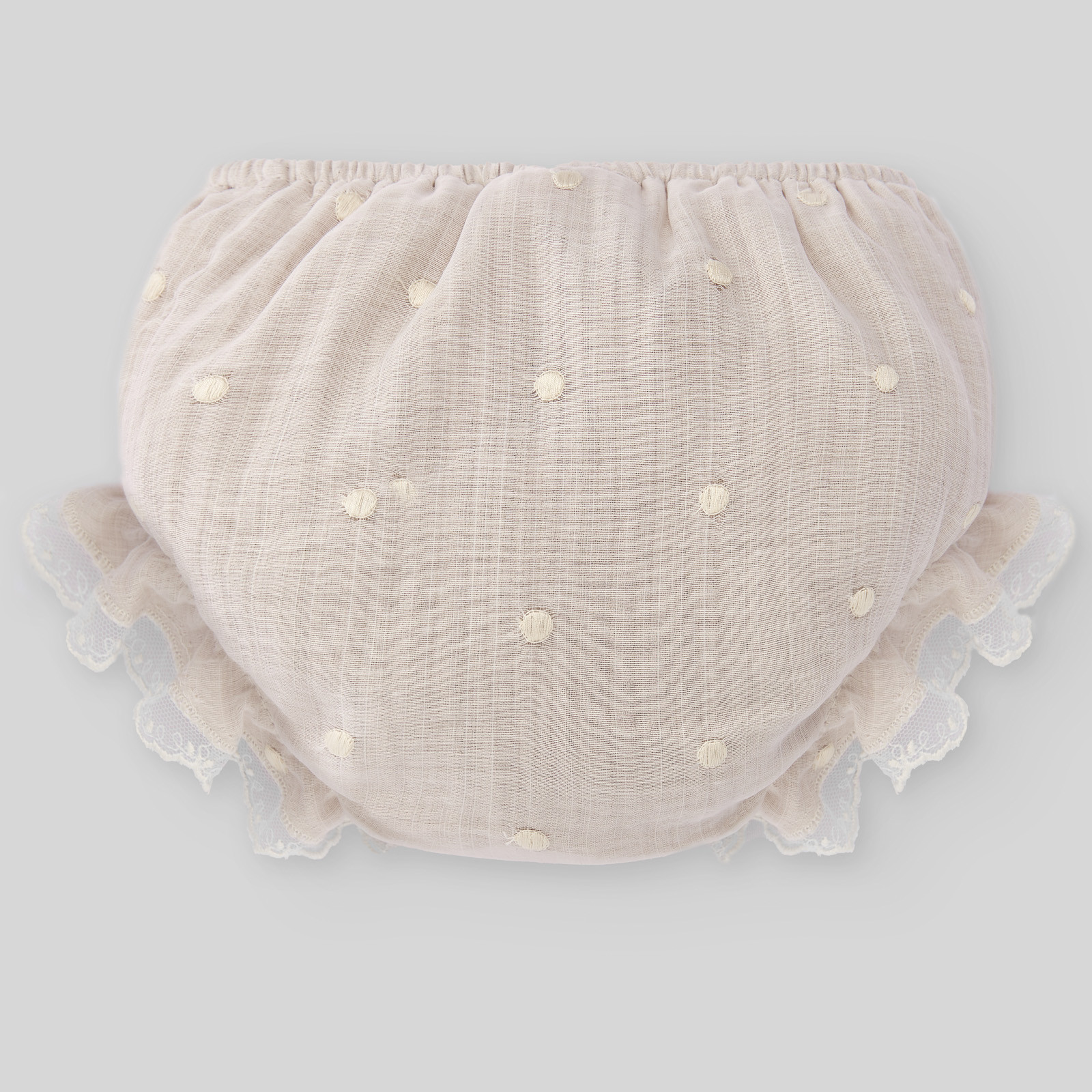 Mutandina per neonata, realizzata in tessuto di organza con ricami di bodoques e pizzo, dallo stile classico perfetto per eventi e occasioni speciali. Dotata di elastici sulle gambe e in vita per una migliore vestibilità e comodità durante la messa e la rimozione.