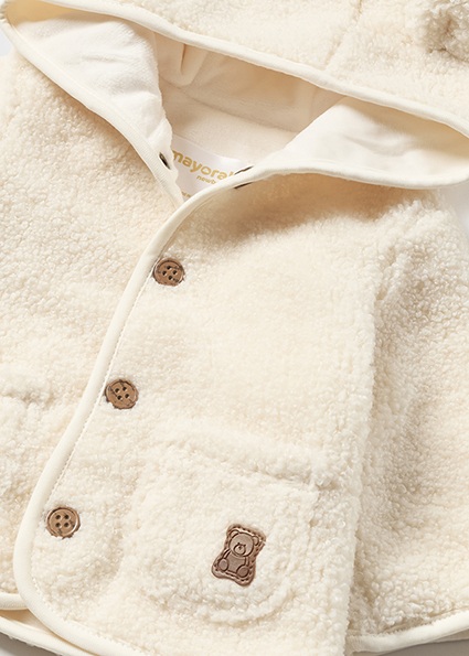 Capotto manica lunga per neonato. Modello con cappuccio. Chiusura con bottoni nella parte anteriore. Parte esterna in pellicciotto ideale per un look caldo. Parte interna del corpo con pellicciotto morbido. Elementi decorativi: applicazione orecchie.